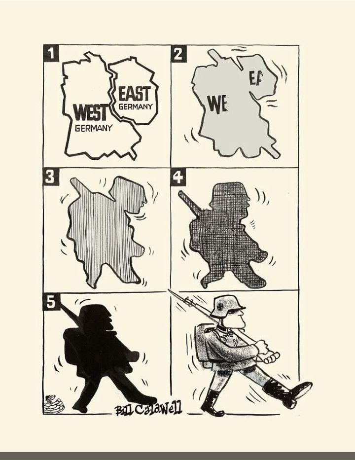 La simple realidad es que todo aquello de la Vergangenheitsbewältigung, la confrontación responsable con el pasado, y el Schuldkomplex, el auto cuestionamiento por la culpa de los crímenes de la nación durante los doce años de su régimen nazi, fue una comedia de posguerra a la que se puso fin en cuanto el país recuperó su soberanía en octubre de 1990. ¿Cómo sino se explica lo que se está gestando?